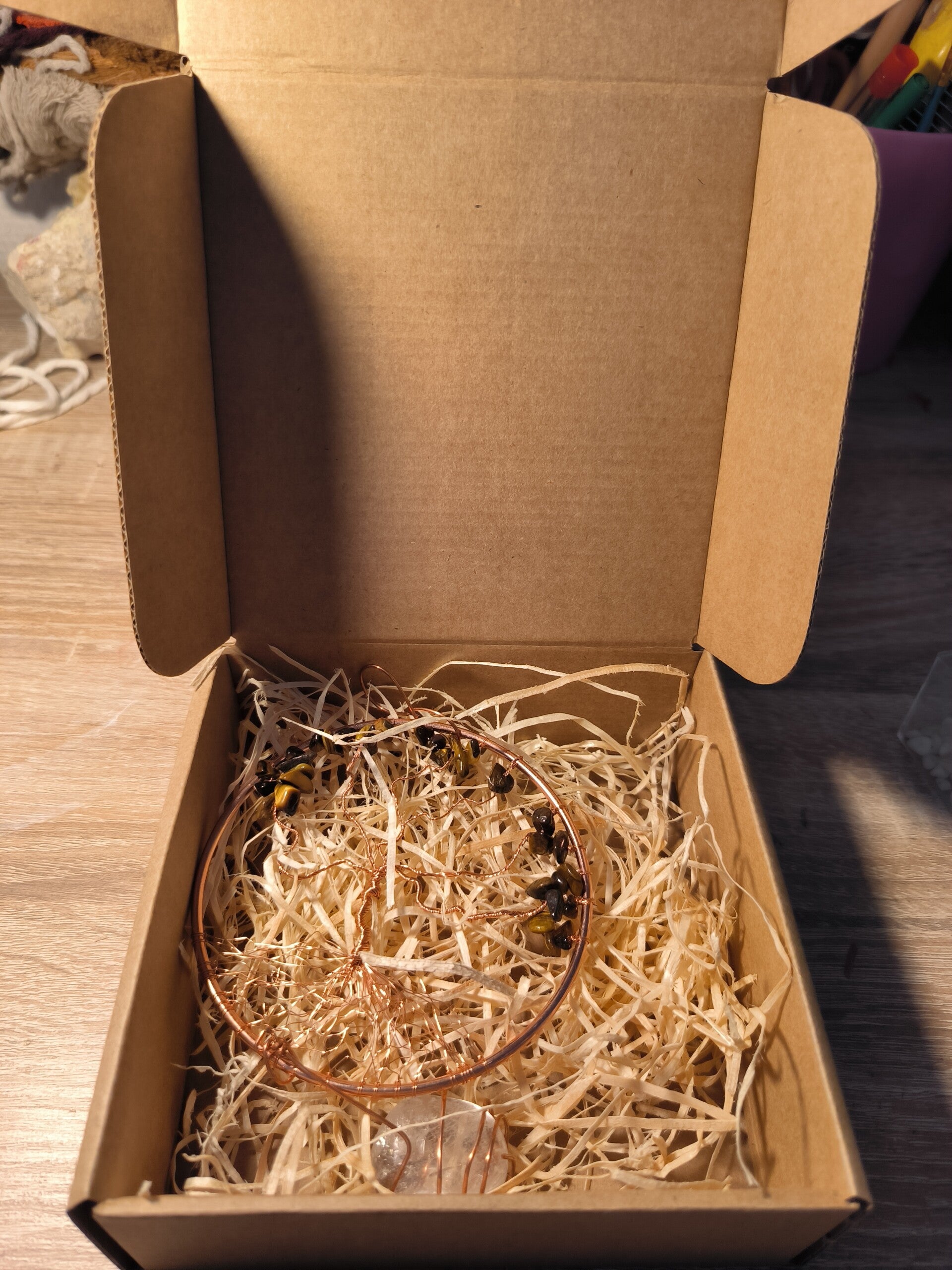 Arbre de vie en cuivre et en oeil de tigre, suspension en cristal de roche
